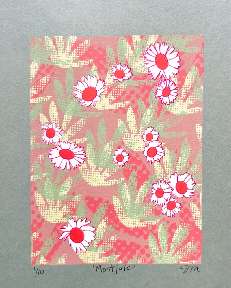 "Montjuic" is a 8 colour screen print printed with water based printmaking inks onto green grey heavyweight paper. The edition is signed and numbered.