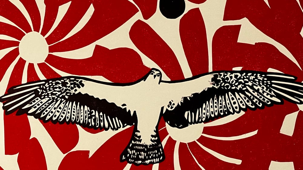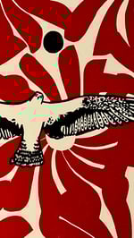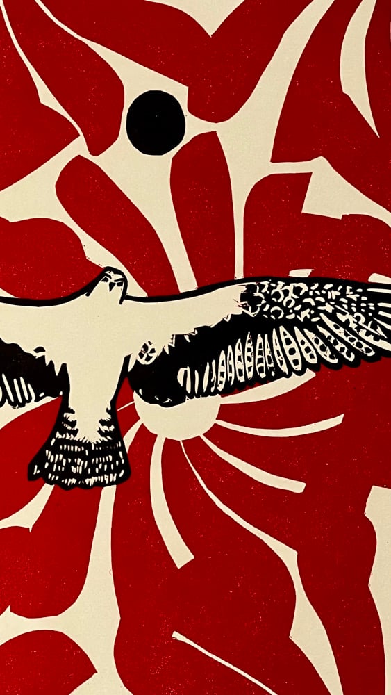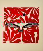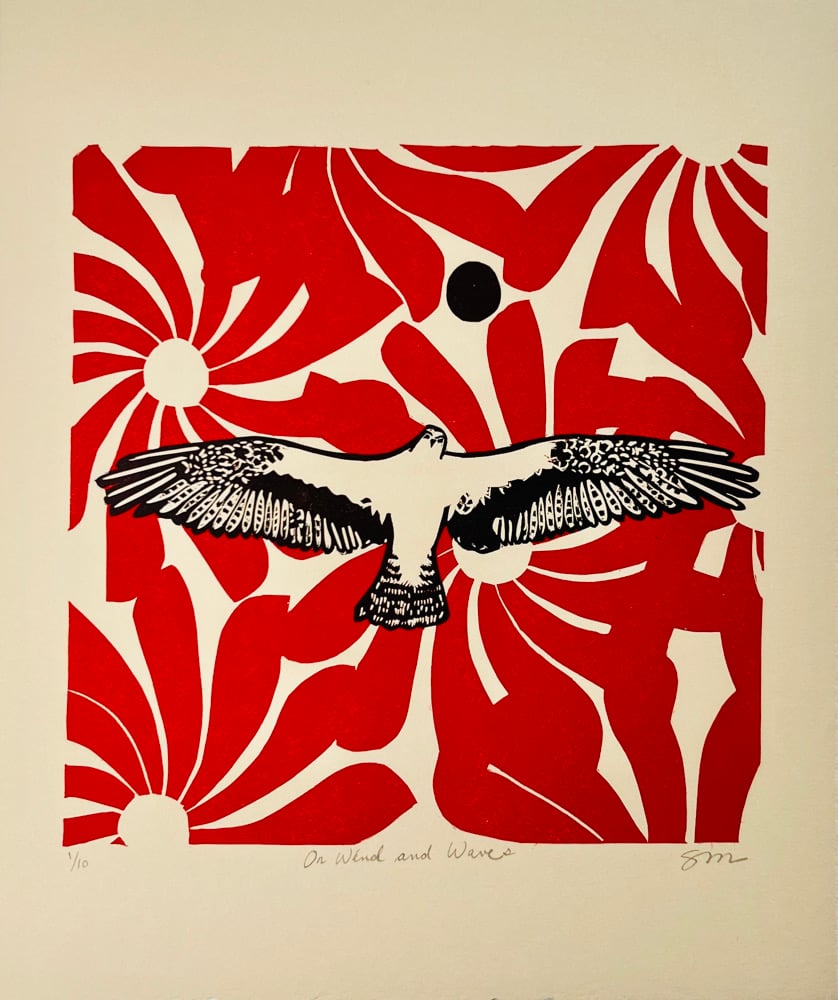 "On Wind and Waves" is a 2 colour reduction style linocut print. This hand-carved image is hand-printed with oil-based inks on cream coloured heavyweight Stonehenge paper. The edition is limited, signed and numbered.