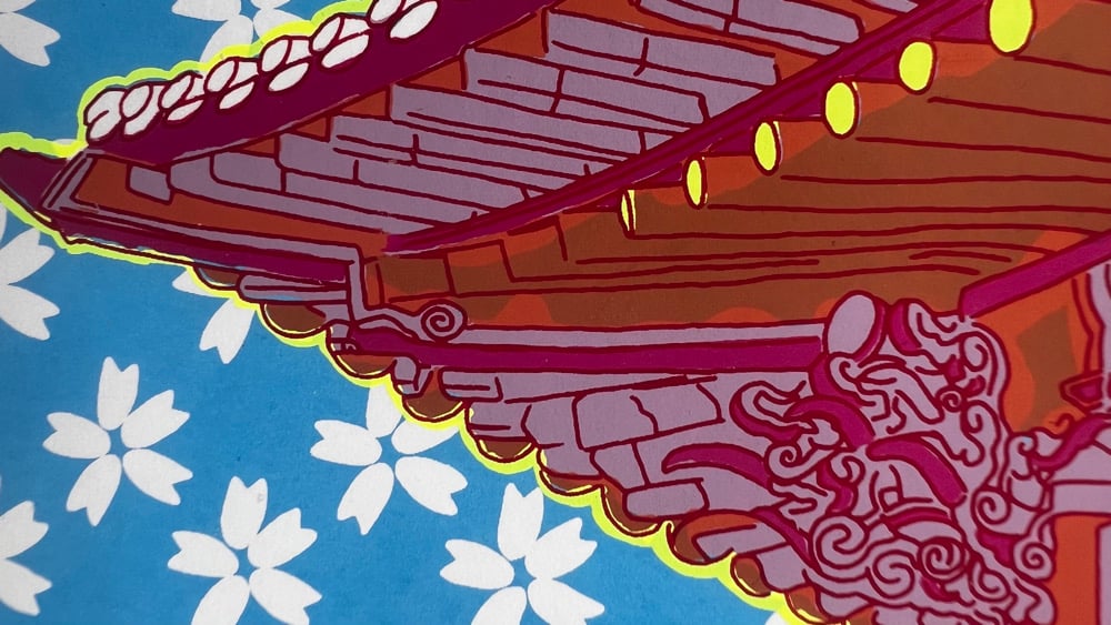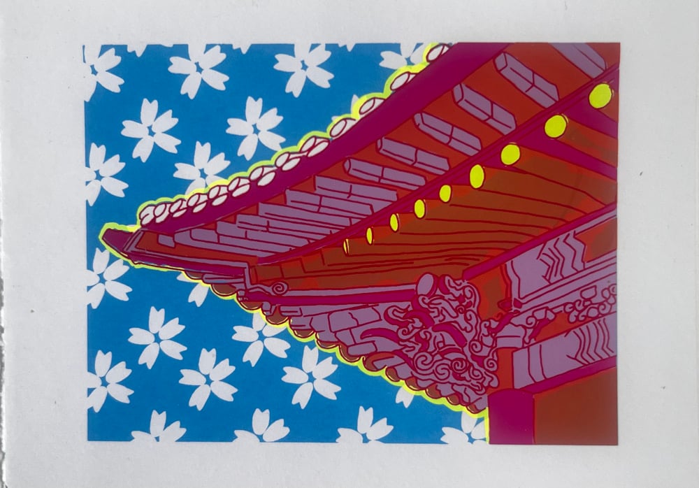 "Temple Remebered" is a 6 colour screen print printed with water based printmaking inks onto heavyweight, white Stonehenge paper. The edition is signed and numbered.